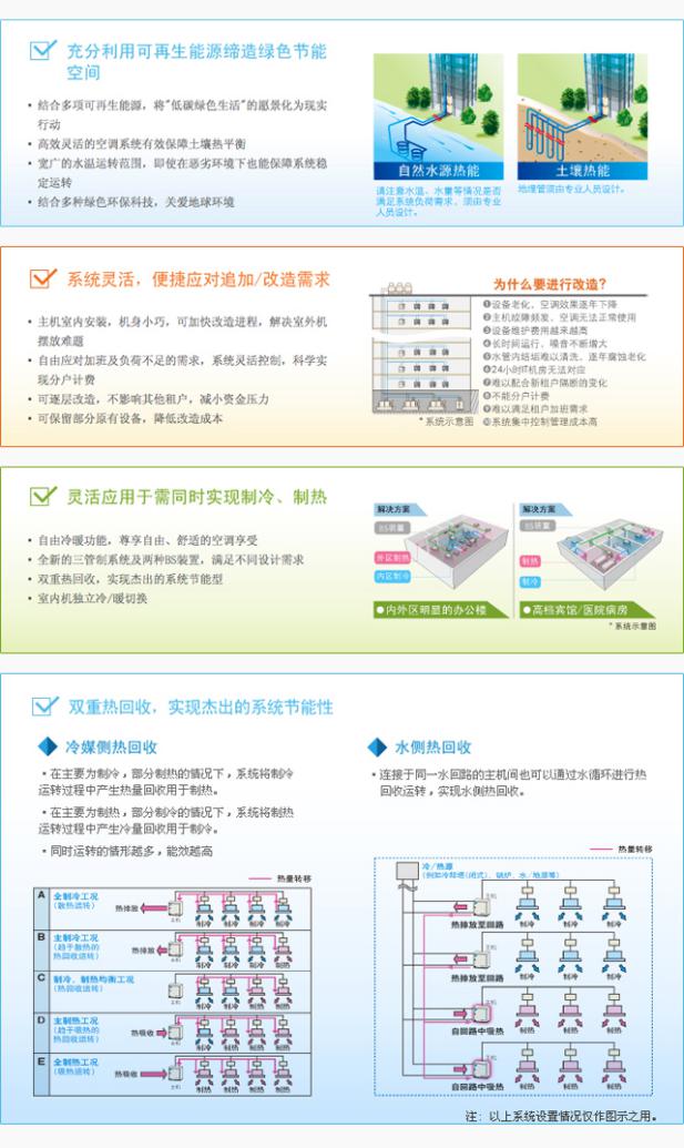VRV 水源熱泵系列,秉承了VRV 系列產品的節能、管理控制方便等優點,在室外換熱側采用了水源作為冷熱源,水側無高低差及管長限制,設計自由度高。熱源側除傳統的鍋爐冷卻塔以外,還可以利用水/地源等可再生能源,讓各類不同需求的現代化建筑的空調方案更加靈活與節能。